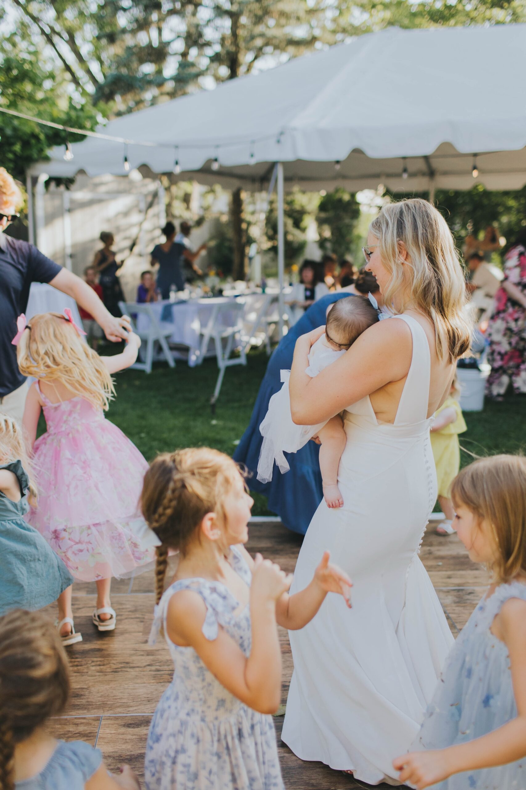 Can you have a baby milestone session, family portraits, extended family portraits, and wedding photos all in one day? When all the stars align, the answer is yes—and that’s just what happened with Sarah, Joe, and their sweet baby, Elle. This beautiful backyard wedding reception was a dream.